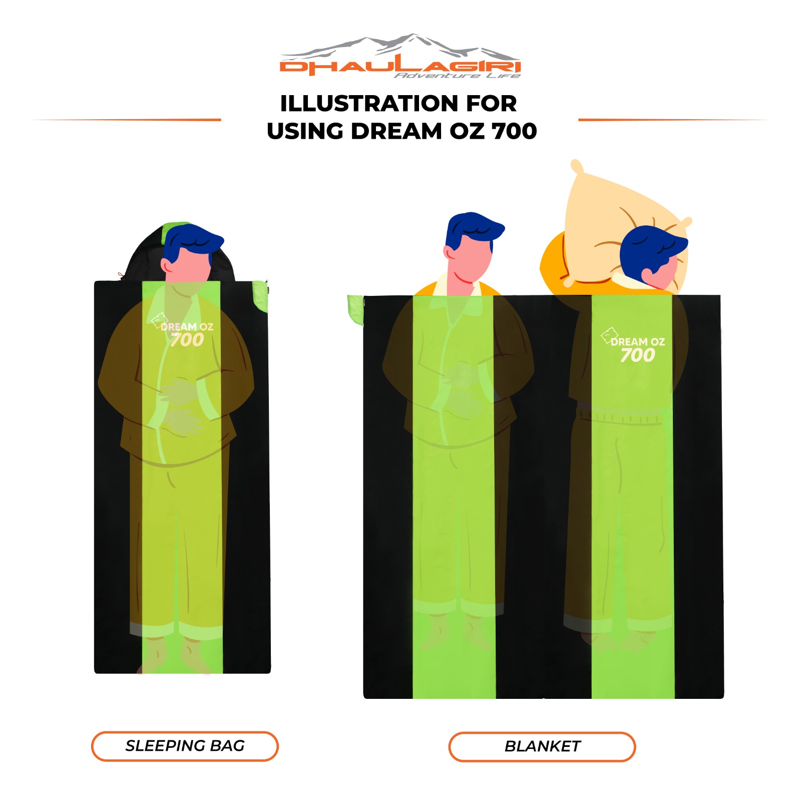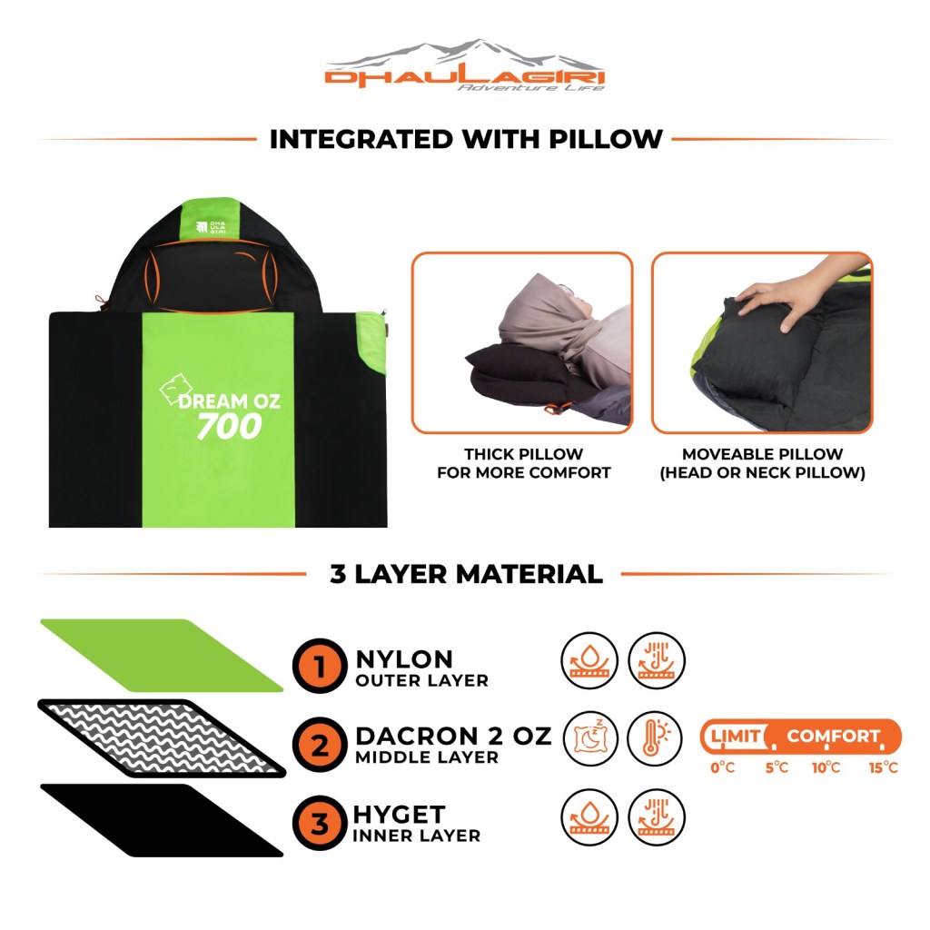 Sleeping Bag Dreamoz 700 multifungsi dan praktis, karena sudah terdapat bantal pada sleeping bagnya, selain itu bantalnya juga lebih besar dan lebih empuk dari versi Dreamoz 700 sebelumnya. Selain itu Dreamoz 700 juga memiliki bukaan resleting sampai bagian bawah sehingga bisa di bentangkan dan dijadikan selimut ataupun sebagai alas.