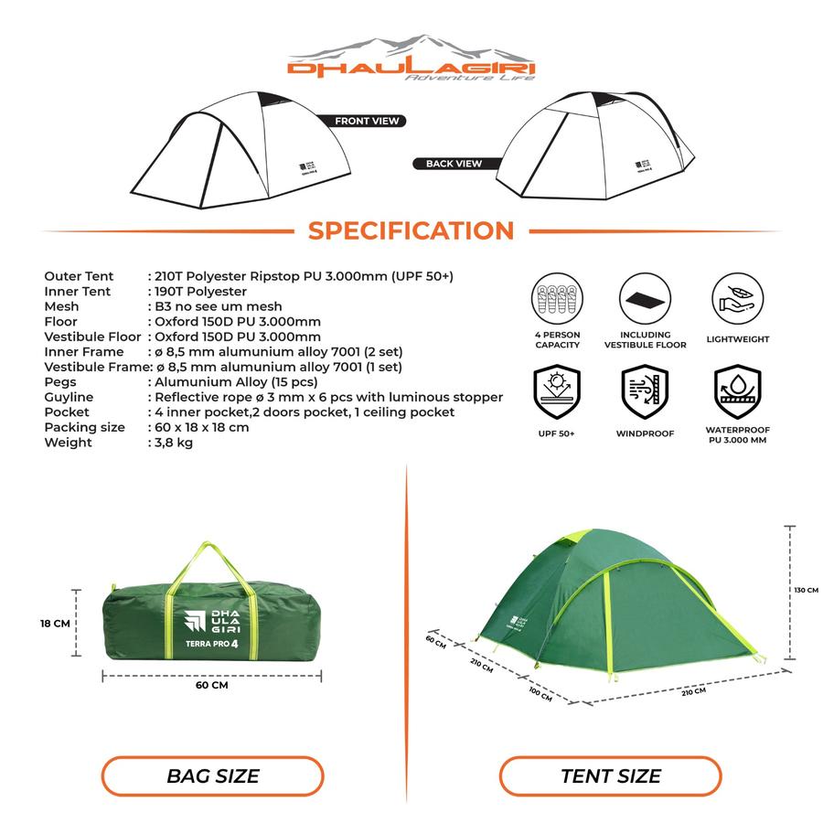 Tenda ini merupakan seri upgrade dari tenda Terra 45 loh. Kini Terra pro sudah menggunakan frame alloy dan juga sudah 2 pintu loh sob. Selain itu tenda ini juga sudah include vestibule floor/alas halaman yang bisa dilipat, wow sangat fungsional bukan. Aksesoris pada tenda ini juga sangat diperhatikan sob, mulai dari guyline yang reflektif, stoppernya luminous, terdapat kantong dibagian sudut dan atas tenda, dan masih banyak lagi. Terra pro 4 ini sangat cocok untuk kalian yang suka naik gunung atau camping2 ceria sob cocok untuk 4 orang loh. Calon tenda viral ini wajib banget kamu miliki buat nemenin kamu berkegiatan outdoor sob, yuk milikin sekarang.