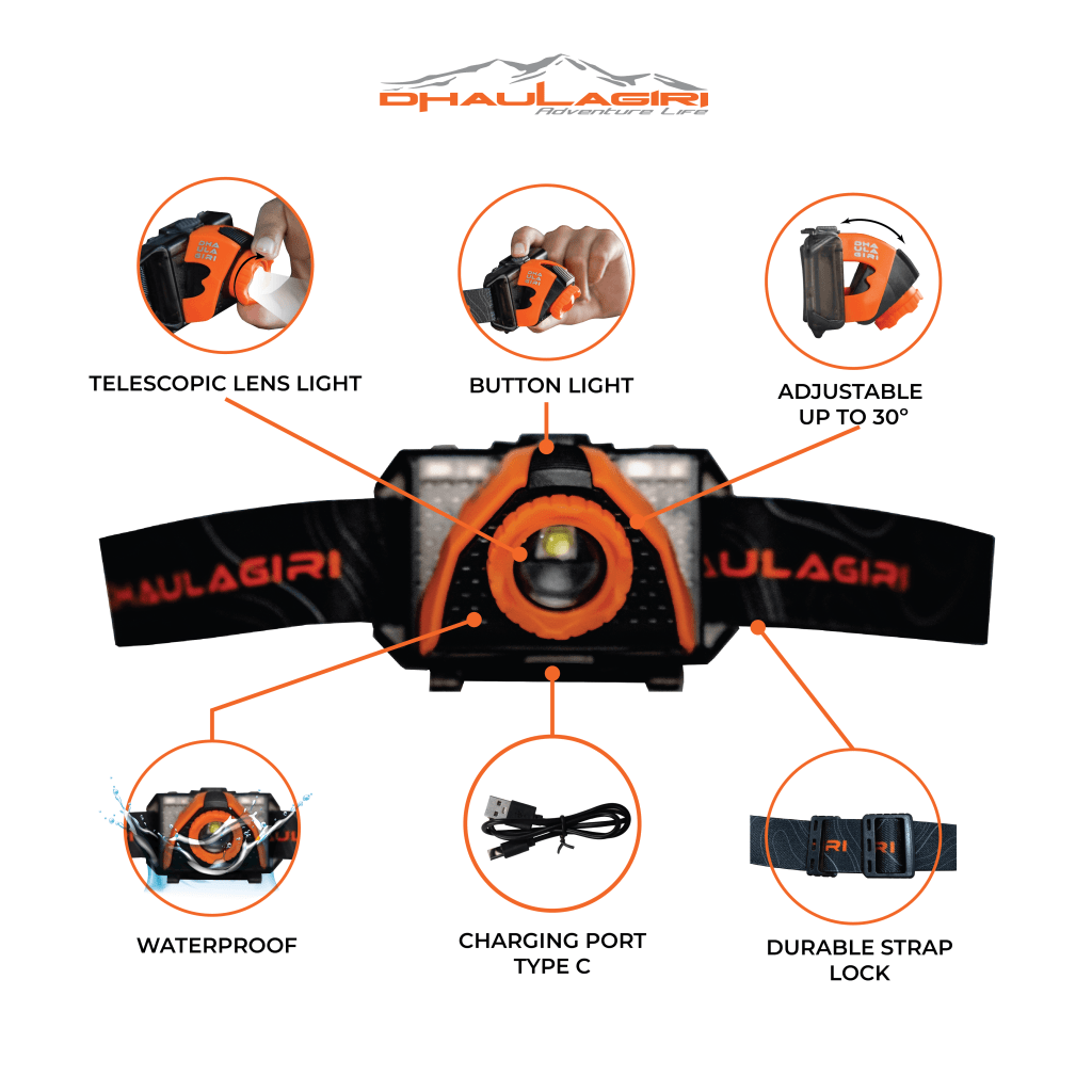 Headlamp merupakan hal yang perlu dimiliki sebagai alat bantu penerangan dan juga bisa sebagai tanda SOS. Headlamp ini dilengkapi dengan pilihan cahaya putih sedang,putih terang,merah, berkedip hijau merah dan cahaya putih terang. Headlamp ini memiliki intensitas cahaya hingga 220 lumens dengan jangkauan cahaya 150 meter, memiliki tingkat ketahanan air IPX4, Strap yang digunakan berbahan nylon sehingga nyaman saat digunakan.