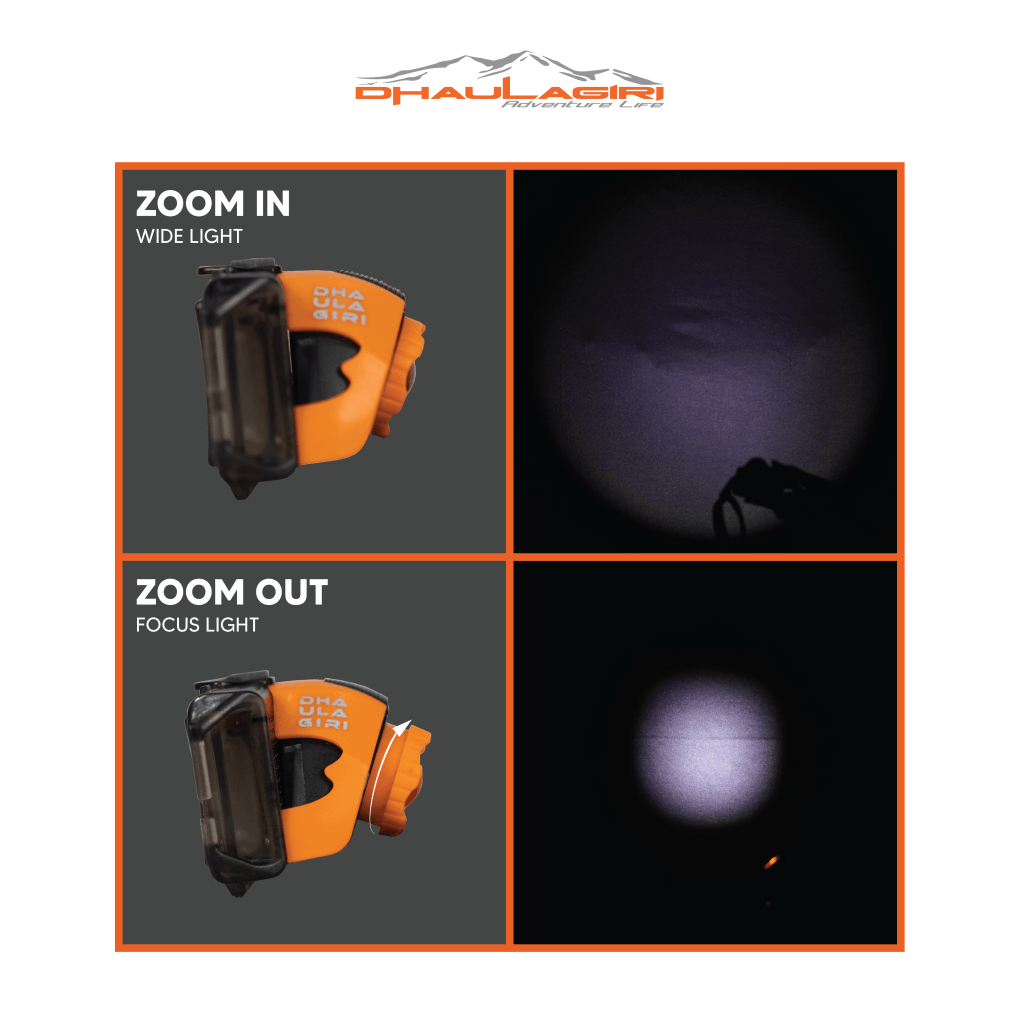 Cahaya headlamp yang bisa disesuaikan dengan kebutuhan baik itu jangkauan dekat dengan men-zoom out dan jangkauan jauh men-zoom in cover lensa depan. Selain itu sudut kemiringannya juga bisa disesuaikan hingga 30 derajat. Baterai dari headlamp ini dapat tahan hingga sekitar 8 jam. Ada 2 pilihan warna dan sudah mendapatkan eva box.