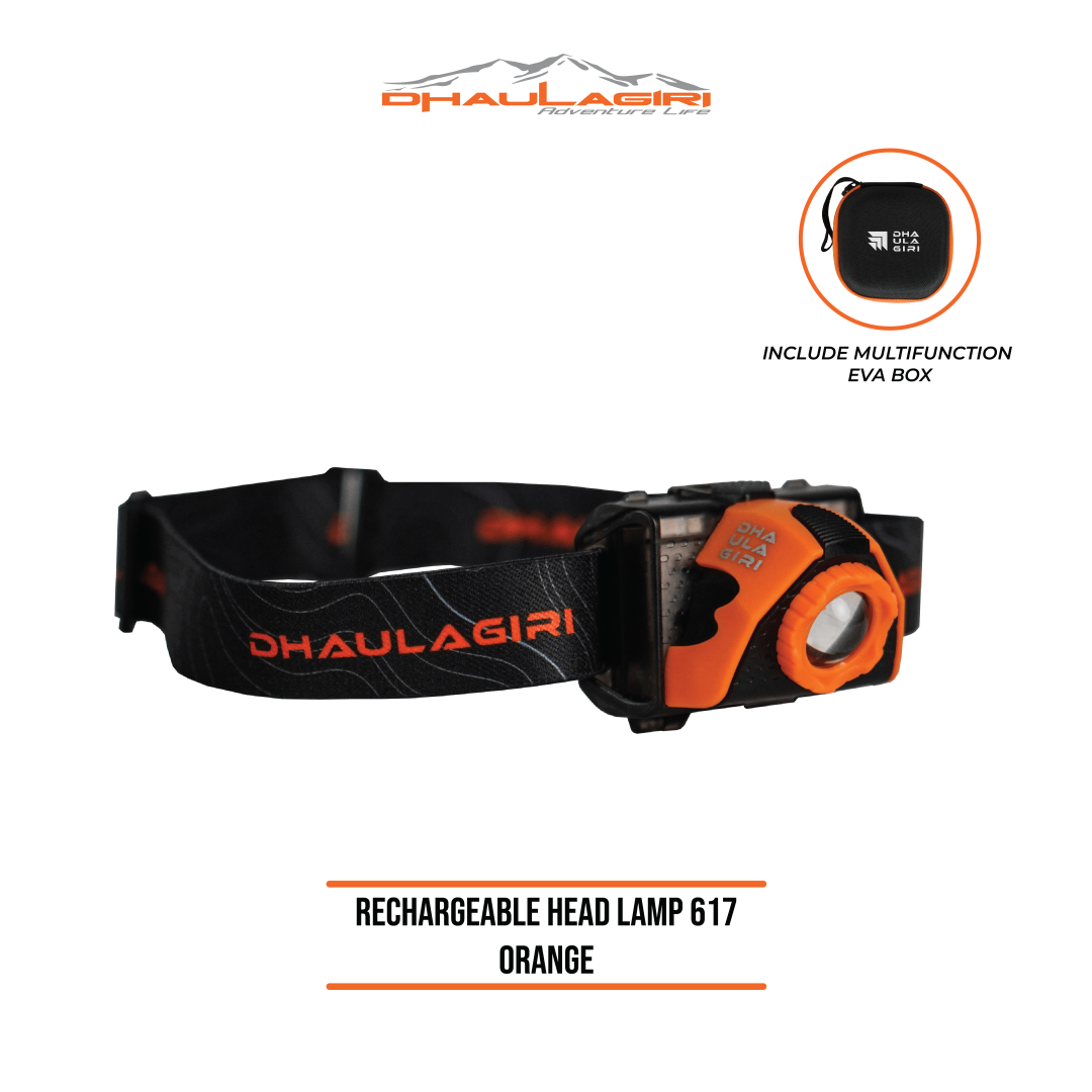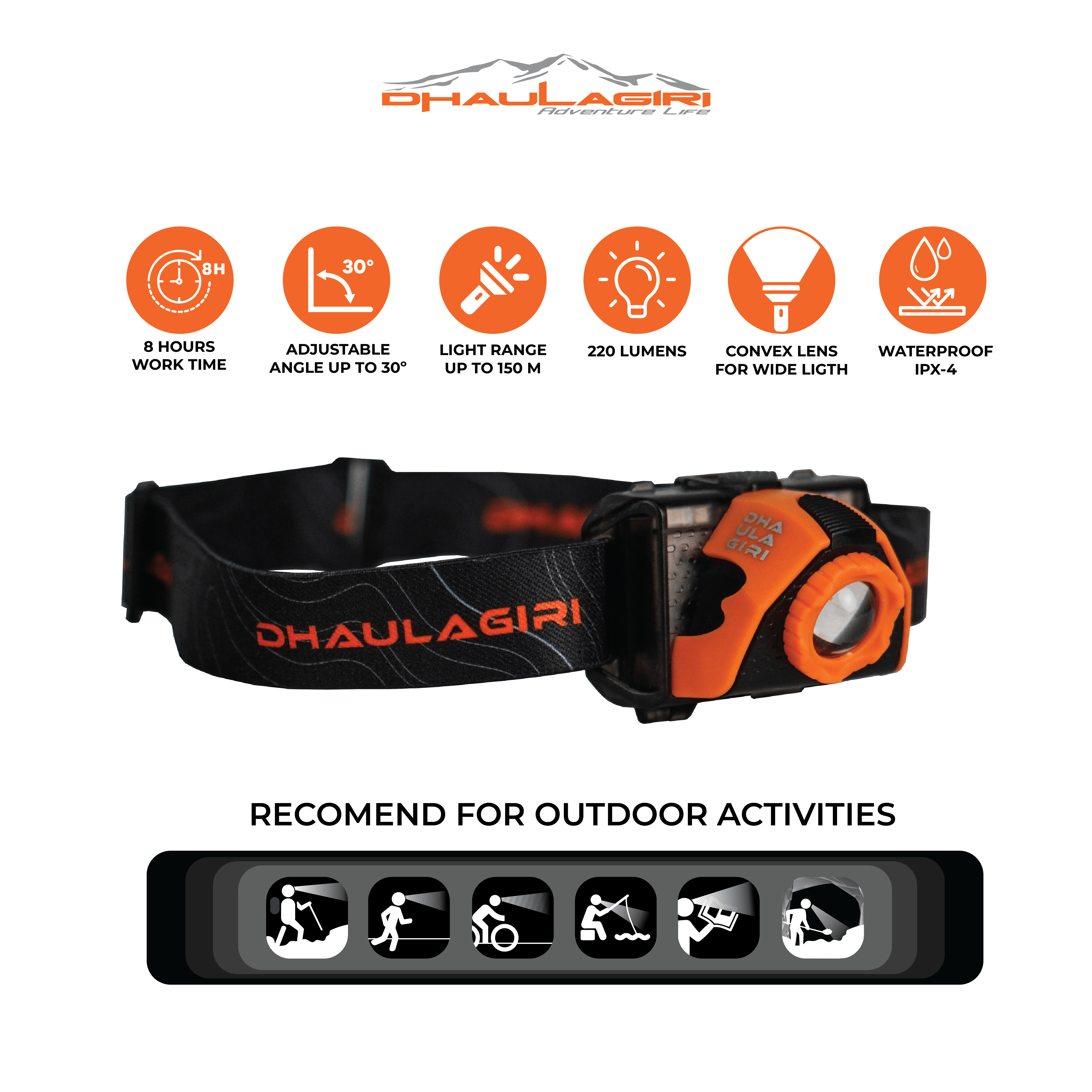 Headlamp merupakan hal yang perlu dimiliki sebagai alat bantu penerangan dan juga bisa sebagai tanda SOS. Headlamp ini dilengkapi dengan pilihan cahaya putih sedang,putih terang,merah, berkedip hijau merah dan cahaya putih terang. Headlamp ini memiliki intensitas cahaya hingga 220 lumens dengan jangkauan cahaya 150 meter, memiliki tingkat ketahanan air IPX4, Strap yang digunakan berbahan nylon sehingga nyaman saat digunakan.