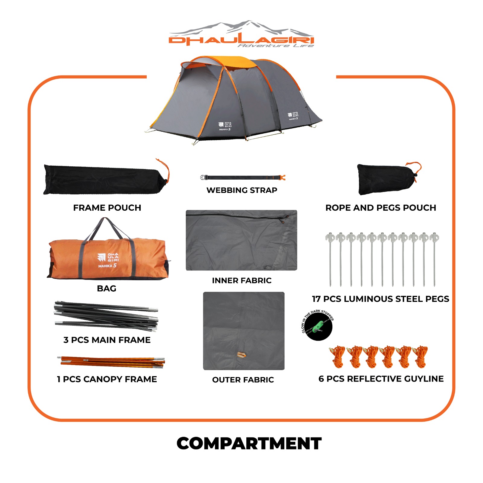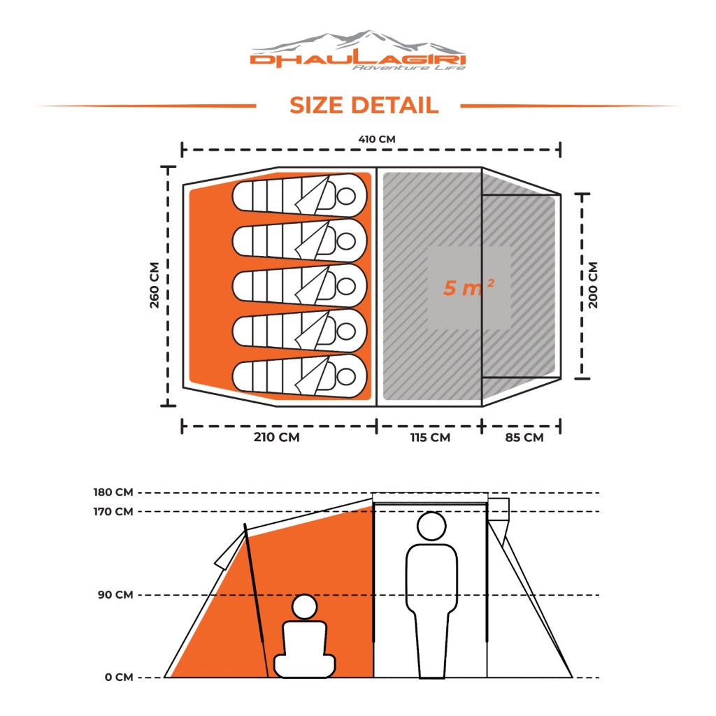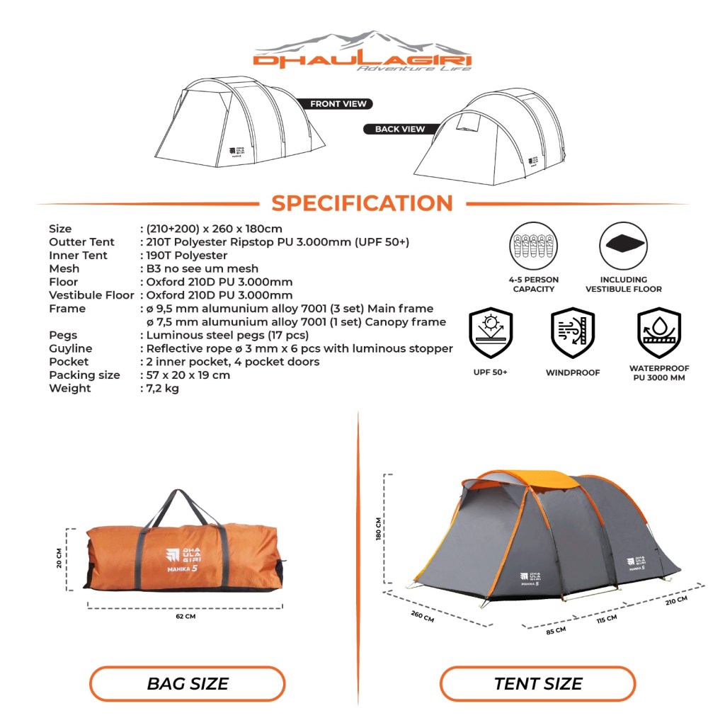 Tenda Mahika 5 ini adalah tenda camping keluarga double layer dengan kapasitas 4-5 orang . Tenda Mahika 5 memiliki tinggi 180cm sehingga kita dapat berdiri dengan leluasa dan berjalan di dalamnya. Tenda ini sudah include dengan vestibule floor yang didesain dengan bentuk kolam sehingga terhindar dari cipratan air atau rembesan air mengalir ketika sobat sedang melakukan aktifitas di halaman tenda. Selain itu, Mahika 5 ini memiliki 3 sirkulasi udara yang sangat baik, dijamin membuat kalian sangat nyaman dan sejuk ketika berada di dalam tenda. Tak hanya itu mahika 5 juga memiliki extra canopy yang berbentuk seperti topi yang berfungsi untuk melindungi sinar matahari ketika pintu depan terbuka, lalu extra canopy ini juga membuat sirkulasi didalamnya tetap baik ketika semua pintu tertutup. Mahika 5 memiliki 3 pintu yang membuat akses untuk keluar masuk sangat mudah.