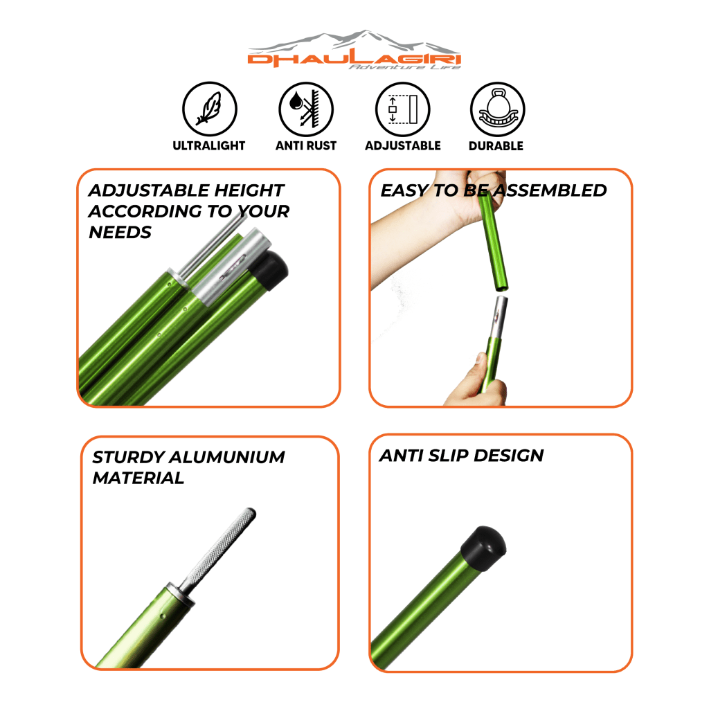 Awning Pole terbaru dari dhaulagiri, dengan warna terbaru green, terbuat dari material alloy yang kuat dan lentur, serta terdapat cover berbahan karet yang terdapat di bagian bawah pole sehingga dapat menahan pole agar tidak menusuk kedalam tanah. Dengan total panjang mencapai 200 cm, serta harga yang terjangkau menjadikan awning pole terbaru dari dhaulagiri ini pilihan yang worth it to buy.