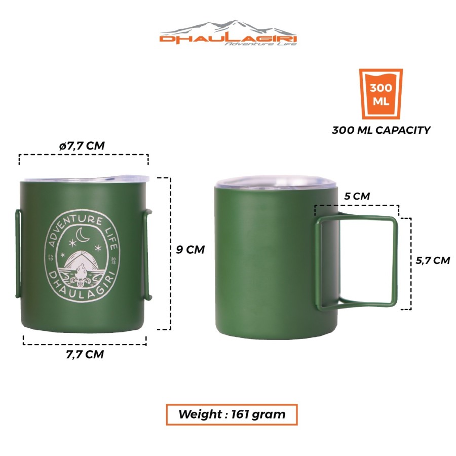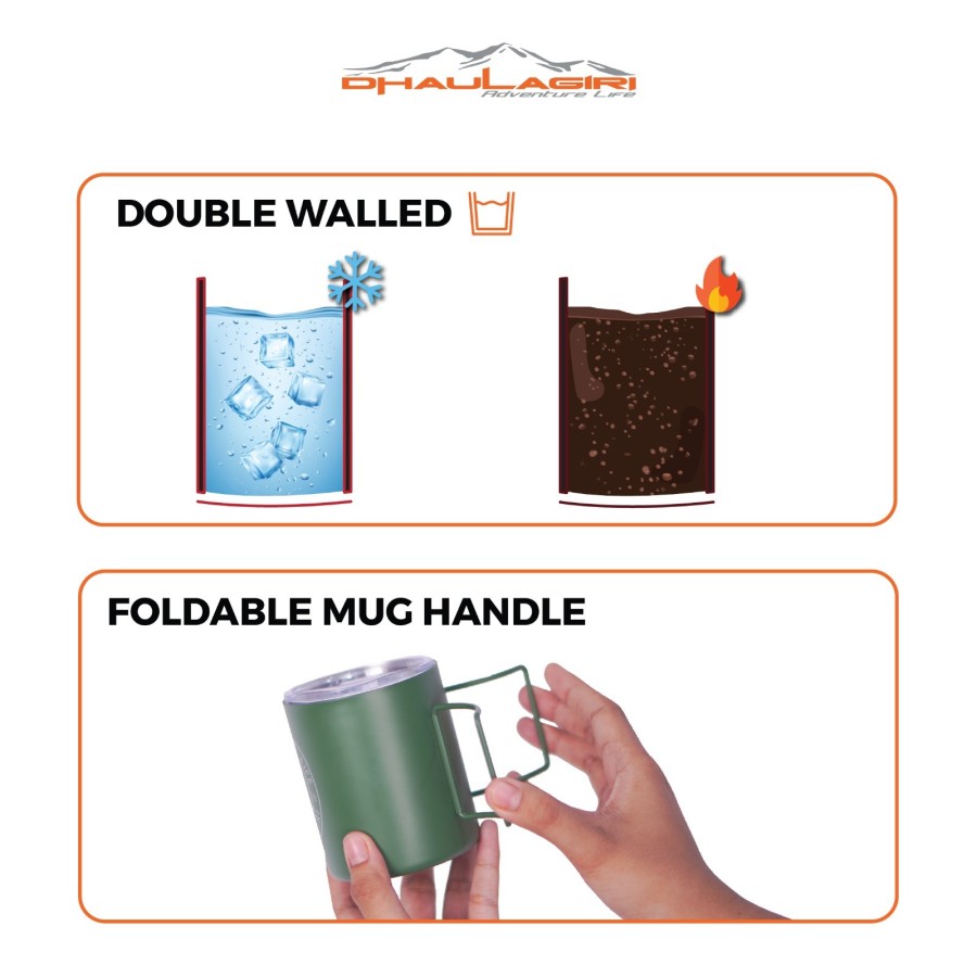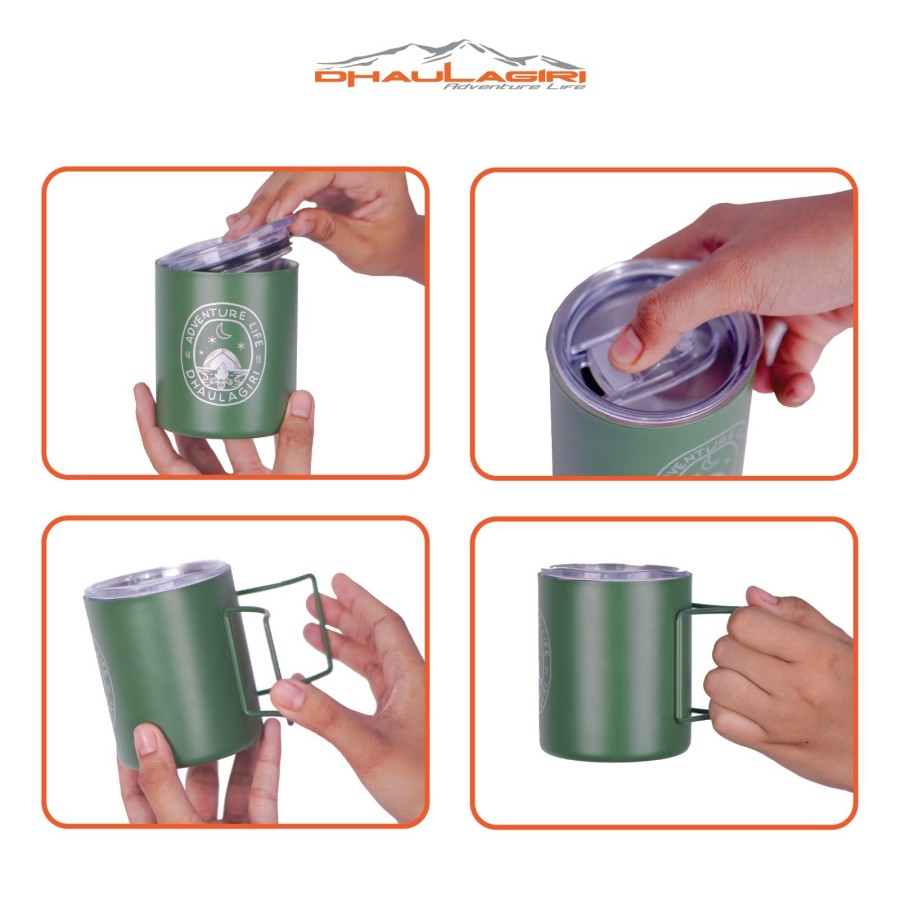 Mug cup yang sudah double wall dengan handle yang bisa dilipat, sangat cocok untuk menjadi teman hiking dan camping. Dilengkapi dengan tutup mug yang dilapisi karet membuat minuman tidak akan tumpah. Tersedia 3 varian warna doff dengan design yang unik.