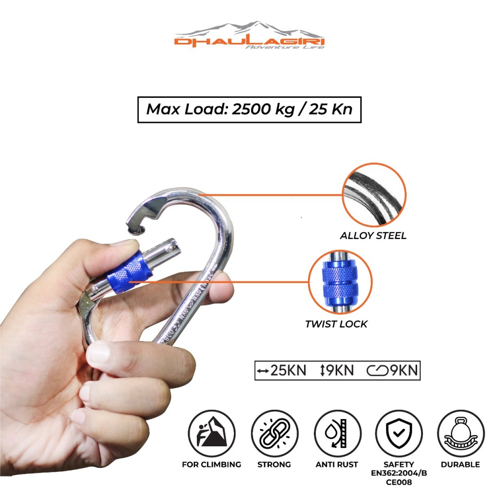 Carabiner Climbing CA 1019 , merupakan produk carabiner terbaru dari dhaulagiri , yang spesial adalah carabiner ini di peruntukan sebagai alat climbing dan telah memiliki sertifikat climbing, jadi sudah aman dan terjamin. Dengan max load nya mencapai 25 Kn (2500 kg) , anti rust , durable.
