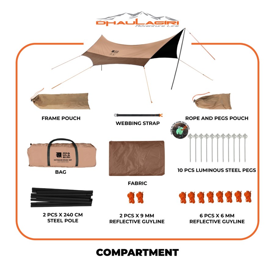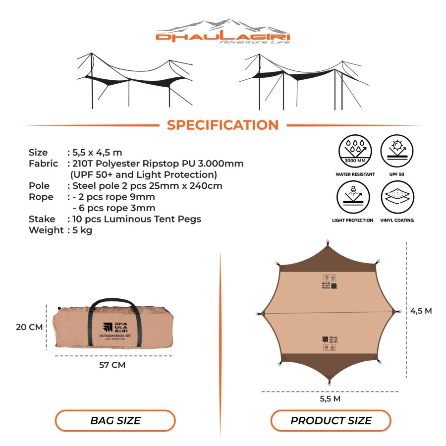 Lengkapi perlengkapan kemping kalian dengan Octagon Bivac Set Light Protection, karena sudah terdapat fitur light blocking dan UPF 50+ sehingga kalian tetap nyaman selama berada di bawah flysheet ini sambil bersenda gurau. Apalagi dengan warna yang earth tone membuat kemping kalian menjadi estetik. Satu set sudah dilengkapi tiang dan pasak jadi siap bawa dan pasang.