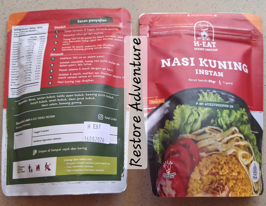 - Nasi Kuning Instant: Beras, santan bubuk, kunyit bubuk, bawang putih bubuk, sereh bubuk, daun salam, kaldu, bawang goreng.