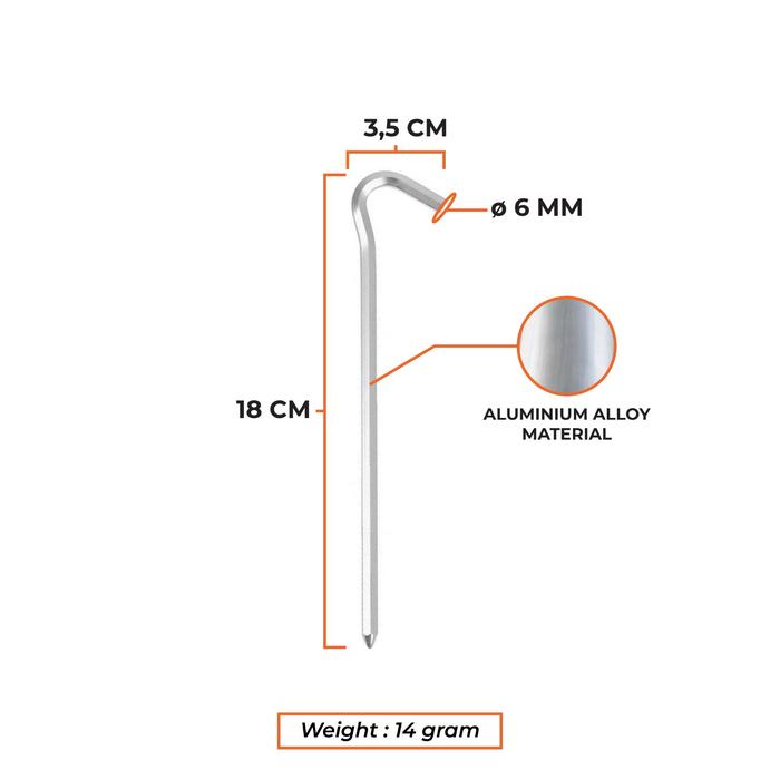 Pasak tenda ini terbuat dari aluminium alloy berkualitas, ringan hanya 14 gram, tapi tetap kuat dan tahan karat.