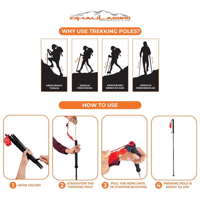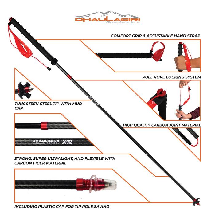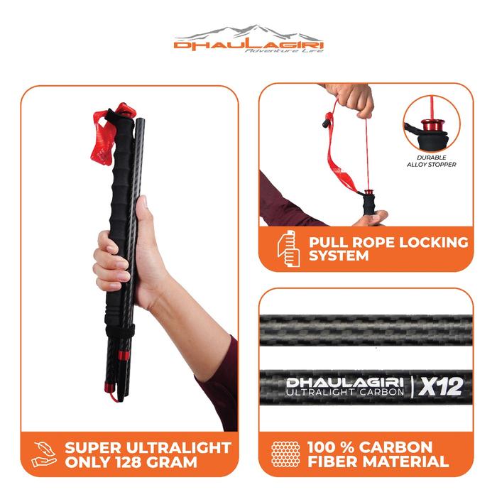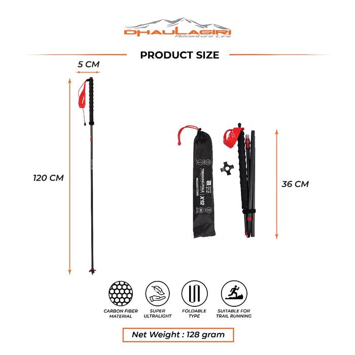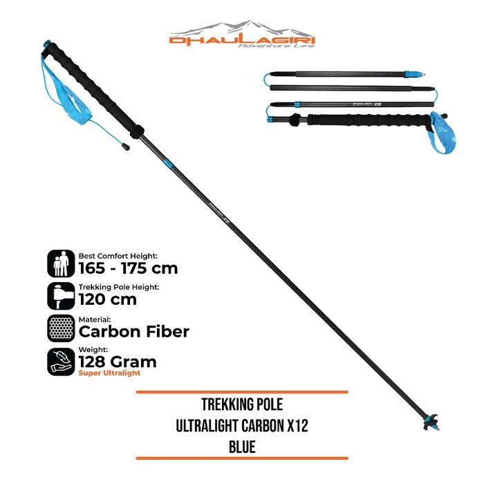 DH Trekking Pole Ultralight Carbon X12 adalah Trekking pole Dhaulagiri super ringan, ideal untuk aktivitas outdoor seperti hiking atau trail running. Berat hanya 128 gram dengan panjang 120 cm, cocok untuk tinggi badan 165–175 cm. Terbuat dari 100% carbon fiber, membuatnya kuat, ringan, dan fleksibel.