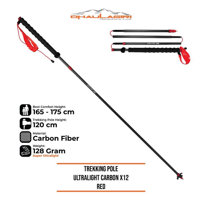DH Trekking Pole Ultralight Carbon X12 adalah Trekking pole Dhaulagiri super ringan, ideal untuk aktivitas outdoor seperti hiking atau trail running. Berat hanya 128 gram dengan panjang 120 cm, cocok untuk tinggi badan 165–175 cm. Terbuat dari 100% carbon fiber, membuatnya kuat, ringan, dan fleksibel.
