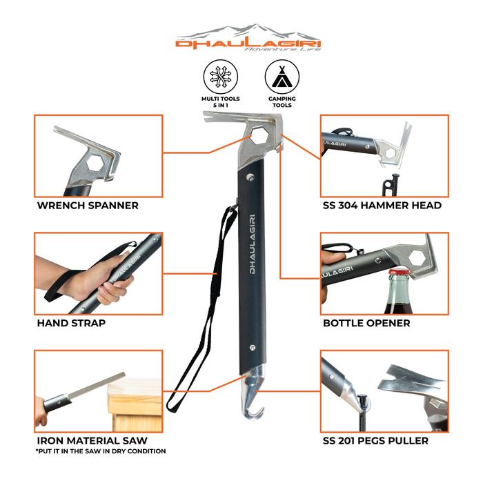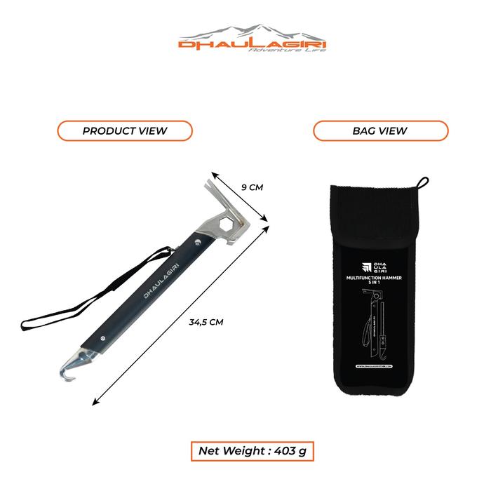 Dhaulagiri Multifunction Camping Hammer 6 in 1 adalah perlengkapan wajib buat kamu yang hobi camping, hiking, atau aktivitas outdoor lainnya. Desain praktis, kokoh, dan multifungsi—nggak perlu bawa banyak alat lagi.