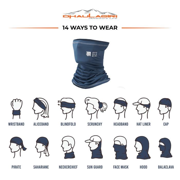 - 14 Cara Pemakaian: Wristband, Aliceband, Blindfold, Scrunchy, Headband, Hat Liner, Cap, Pirate, Sahariane, Neckerchief, Sun Guard, Face Mask, Hood, Balaclava — semua bisa kamu bentuk hanya dengan satu bandana