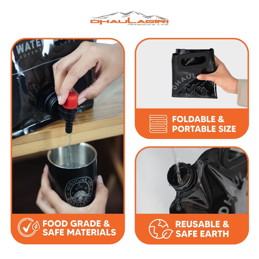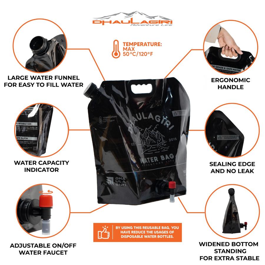 Dhaulagiri Water Bag merupakan tempat penampungan air yang dapat dilipat dengan design lebih compact, terbuat dari material ramah lingkungan, food grade, serta non toxic, sehingga aman untuk menyimpan air minum. Water bag ini juga terdapat keran pada bagian bawah sehingga memudahkan dalam penggunaannya.